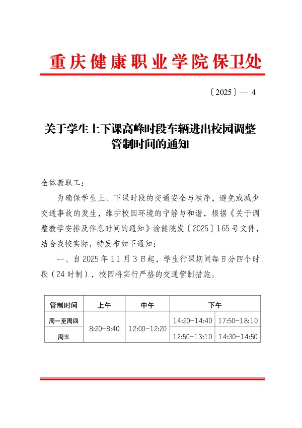 关于学生上下课高峰时段车辆进出校园调整管制时间的通知
